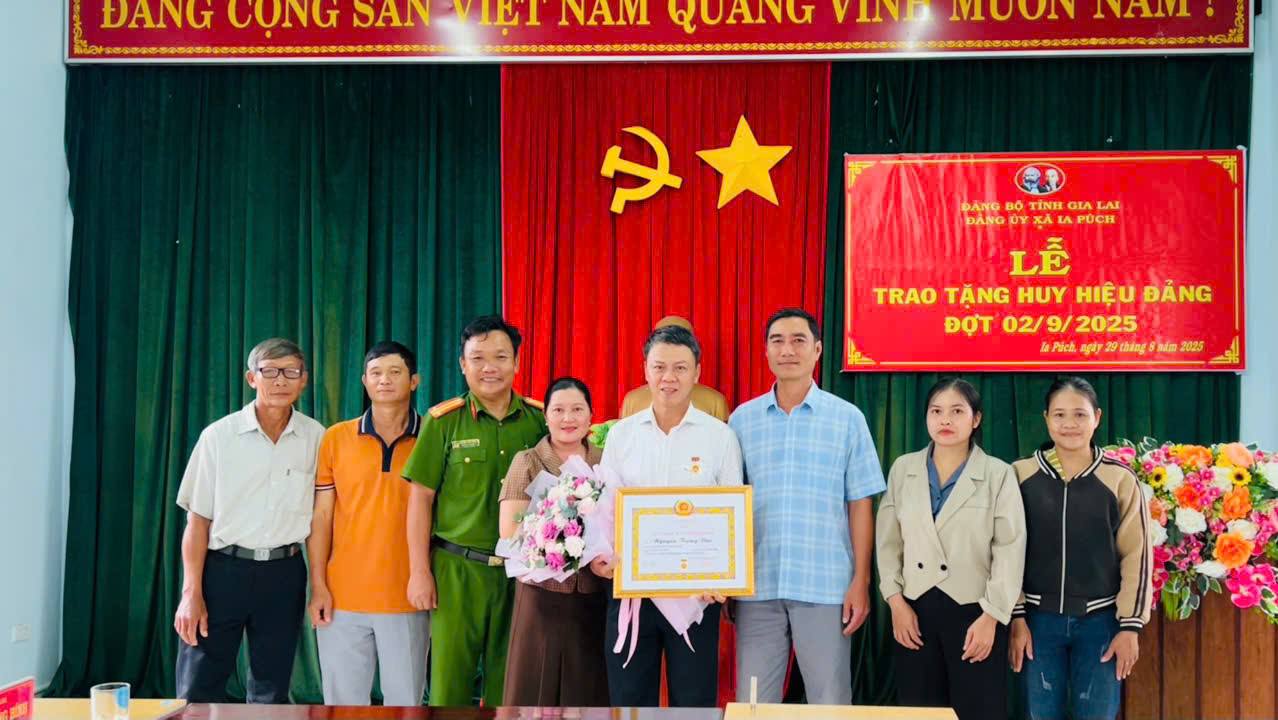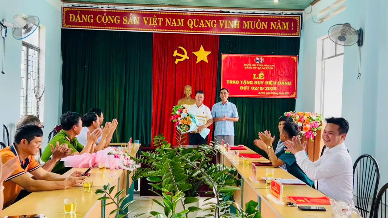 Đồng chí Vũ Đình Hiền - Phó Bí thư Thường trực Đảng ủy trao tặng Huy hiệu 30 năm tuổi Đảng cho đồng chí Nguyễn Trọng Đào - Bí thư Chi bộ kiêm thôn trưởng Làng Brang.