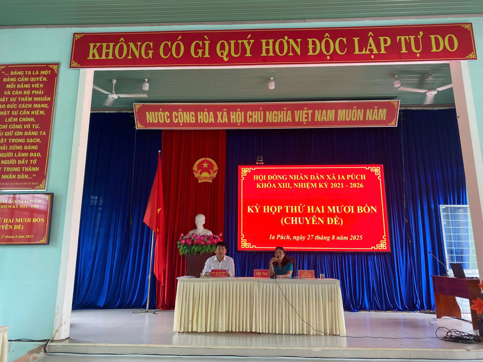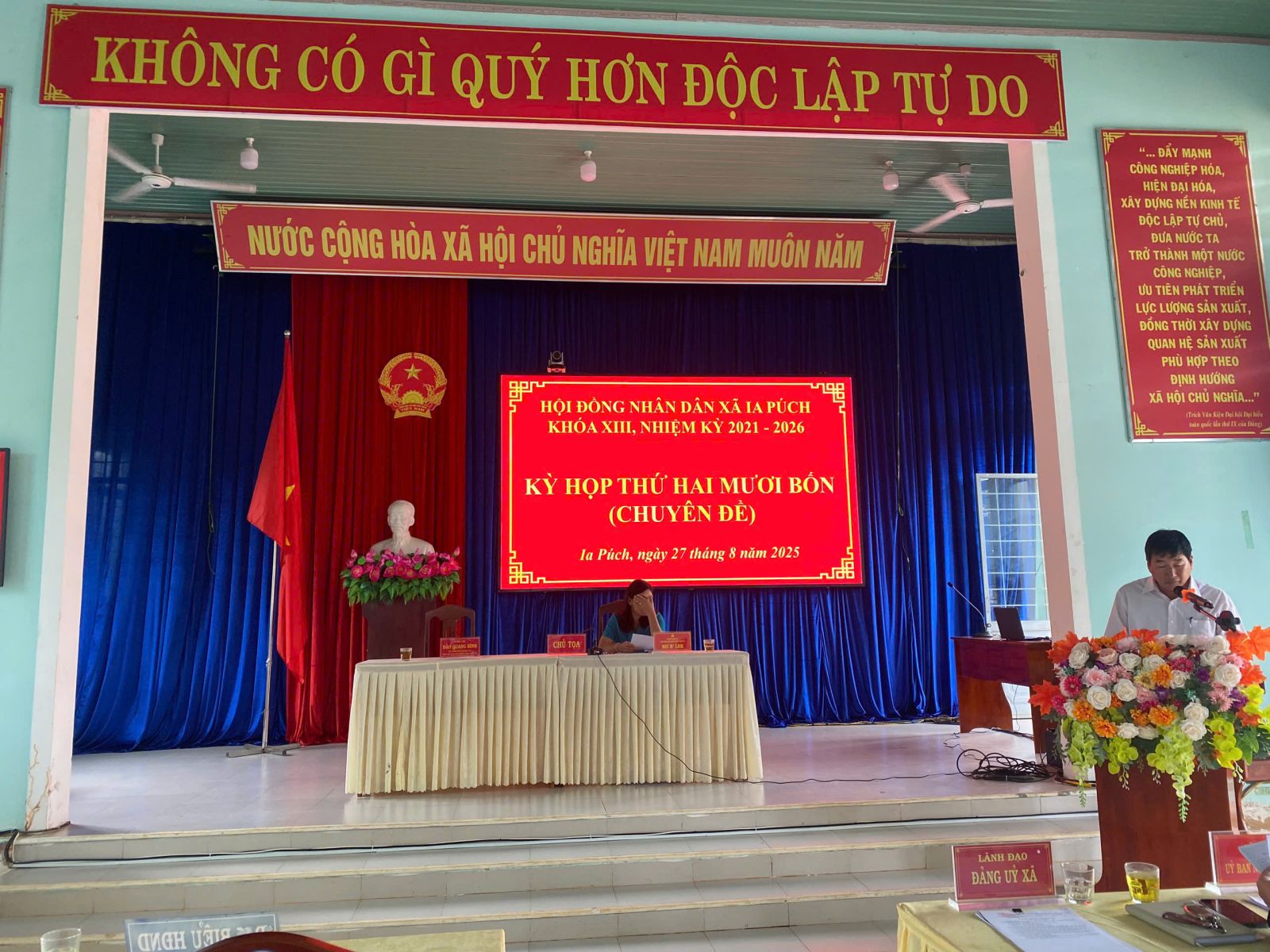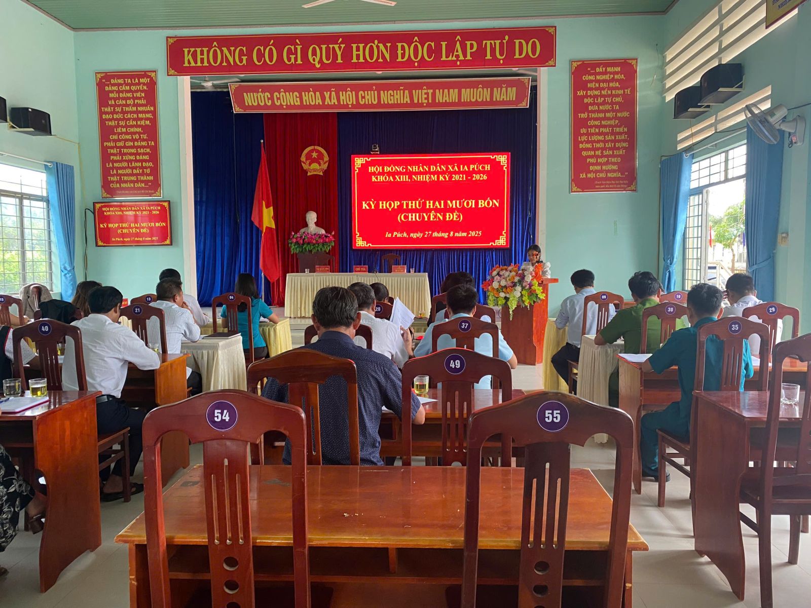 Chiều ngày 27 tháng 8 năm 2025, tại nhà Văn hoá xã Ia Púch Hội đồng nhân dân (HĐND) xã khóa XIII, nhiệm kỳ 2021 – 2026 tổ chức kỳ họp lần thứ Hai mươi bốn (chuyên đề) nhằm xem xét, thảo luận và quyết nghị một số nội dung quan trọng thuộc thẩm quyền.