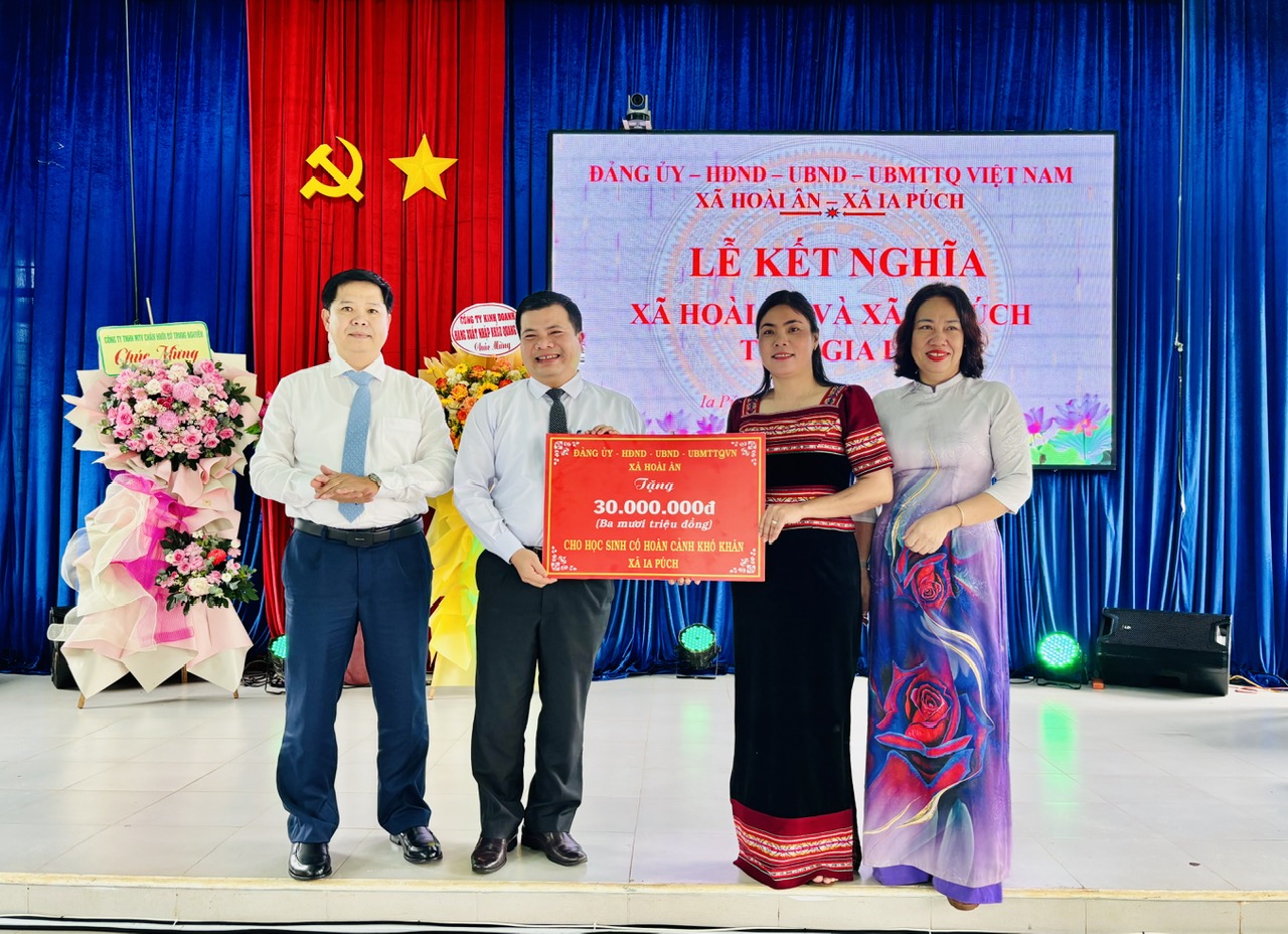 Nhân dịp này, xã Hoài Ân đã trao tặng 30 triệu đồng hỗ trợ học sinh có hoàn cảnh khó khăn trên địa bàn xã Ia Púch, thể hiện nghĩa cử cao đẹp, đậm tình đồng chí, đồng bào.
